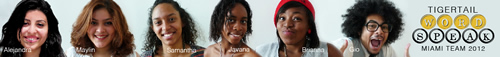 ![]() Cartoon Images © Chris Meesey 2012 WordSpeak Team Heads to Brave New Voices Tigertail's WordSpeak spoken word team will compete in Brave New Voices, the international youth poetry slam festival held this year in the San Francisco Bay area from July 17 to 21, 2012. For the 8th year in a row, the Tigertail WordSpeak team has been invited to compete in this prestigious festival, selected from among the nearly 100 teams who applied. The Olympics of spoken word, Brave New Voices includes over 500 youth poets from 50 cities across the U. S. as well as from as far away as England and Taiwan. The Miami team was chosen from a field of more than 1000 teenagers from local high schools who participated in our WordSpeak and SpeakOut programs. This year's team is made up of Maylin Enamorado from Miami Arts Charter; Brianna Woods from Miami Northwestern Senior High; Javana Dunnom, from North Miami Senior High; Alejandra Nunez, who graduated from DASH; and Giovanni Garced and Samantha Turner, who graduated from North Miami Beach Senior High. Alejandra, Giovanni and Samantha return from last year's team, which made it all the way to the semi-finals.